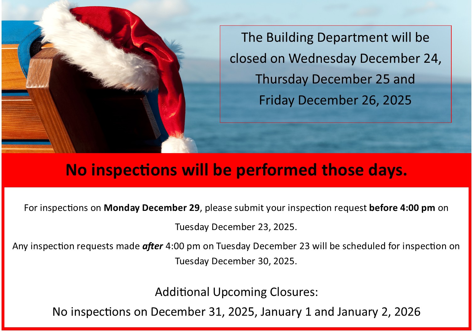 To request an inspection, complete the “Inspection Request Form” located at the top of the page. Inspections are conducted the next business day. The inspection request cut off time is 4:00pm (on a business day) for next business day inspections.