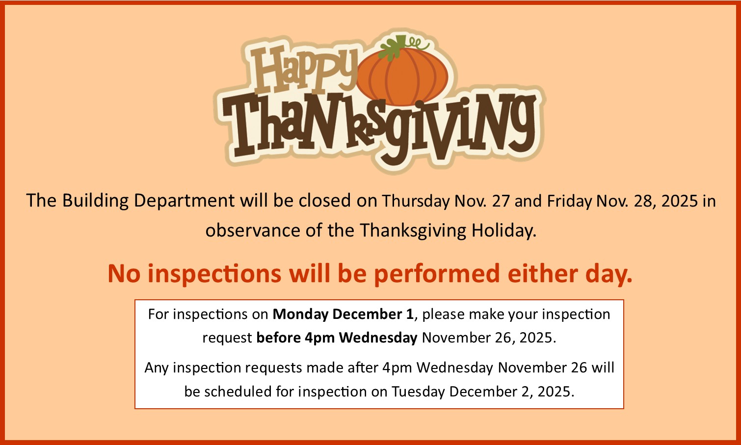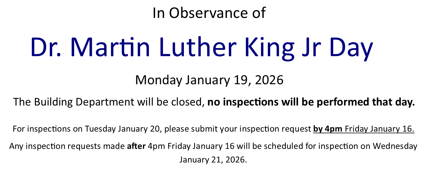 To request an inspection, complete the “Inspection Request Form” located at the top of the page. Inspections are conducted the next business day. The inspection request cut off time is 4:00pm (on a business day) for next business day inspections.